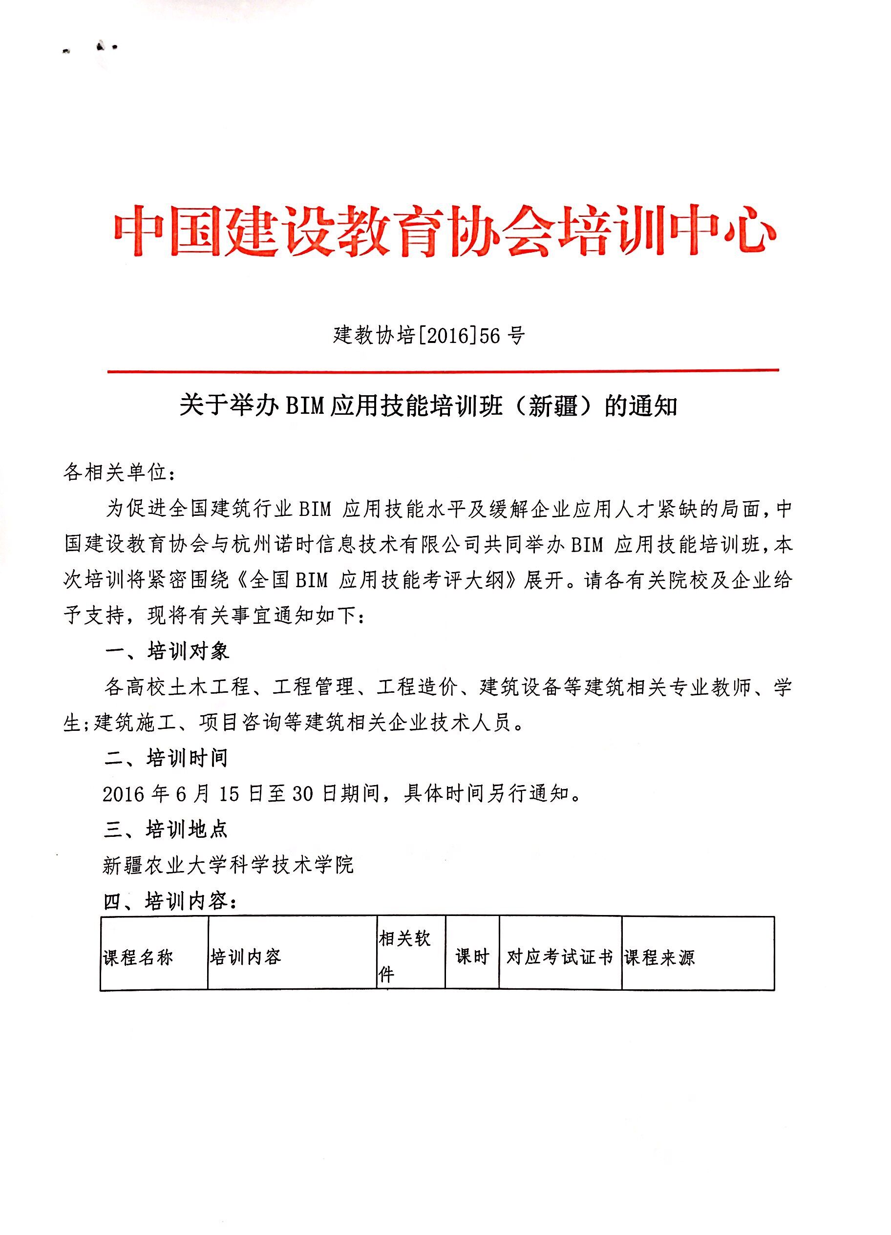 建教协培[2016]56号 关于举办BIM应用技能培训班(新疆)的通知