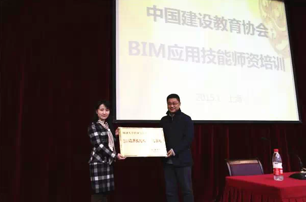 2015年1月24日,“ 协会BIM应用技能教学示范基地”揭牌仪式在同济大学逸夫楼顺利举行, 协会秘书处副秘书长、远教部主任胡晓光, 协会BIM专家委员会副主任、同济大学经济与管理学院副院长王广斌,同济大学经济与管理学院高层管理培训(EDP)中心执行主任龚烜出席了该仪式。