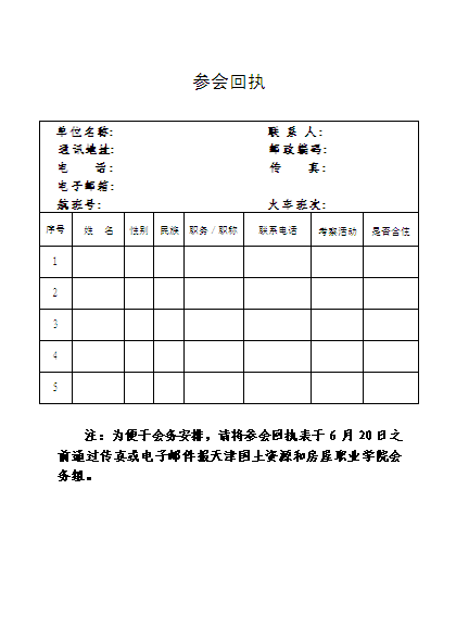 2、详细填写参会回执于6月20日前通过传真或电子邮件发会务组,届时安排机场、火车站接送。