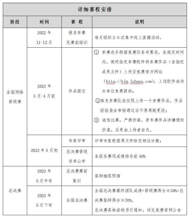 本阶段以网络提交作品的形式。项目案例自选,参赛团队根据所报竞赛赛项在比赛官网上传竞赛作品,成果通过竞赛官网(http://bim.lubanu.com)提交并集中展示,作品上传截止时间为2023年4月10日。作品提交要求:请按每个赛项的任务书要求的规范进行提交(各赛项的任务书见附件一)。
